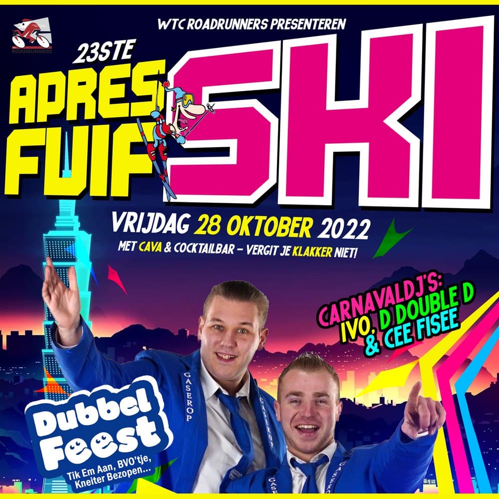 D Double D is alombekend van Carnavalstent Het Volkhuis, terwijl DJ Ivo elk jaar carnavalskroeg Den Oosthoek op z’n kop zet. Cee Fisee doet de kar van de Strandreetjes daveren en geeft ook het beste van zichzelf bij Sonny in Café De Bolle. Voor Cee Fisee is dit de vuurdoop op onze Apres-Ski Fuif, hij ziet het volop zitten, hopelijk geen stress voor hem ! Carnavalsact Dubbel Feest komt op optreden, bekend van de carnavalshit “Tik Em Aan”. Wie er niet genoeg van krijgt, kan na onze fuif nog even loos gaan op de afterparty in Café Den Oosthoek waar Philip je met open armen zal ontvangen… tot in de vroege uurtjes. Er zal nog poester en passoa te verkrijgen zijn !