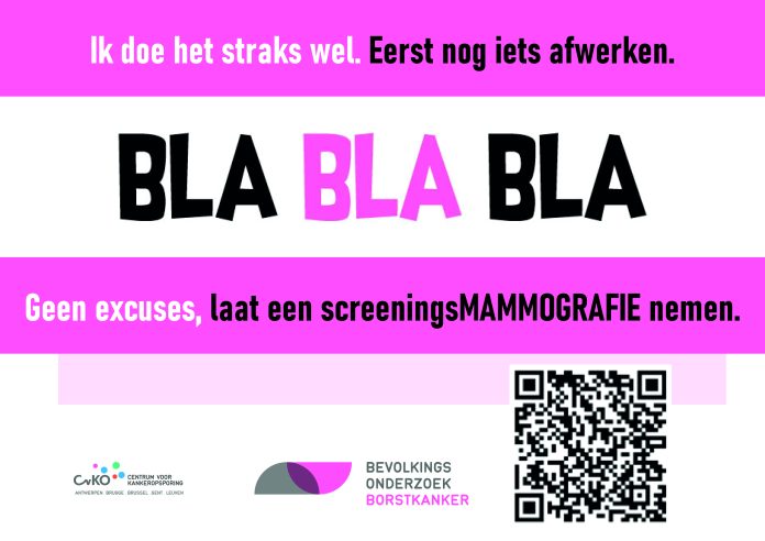 Vroegtijdige opsporing is de beste bescherming tegen borstkanker. Laat van je 50ste tot en met je 69ste elke twee jaar een screeningsmammografie nemen. Jullie ontvangen hiervoor een brief met een uitnodiging. Het onderzoek is gratis en snel. Geen excuses dus.