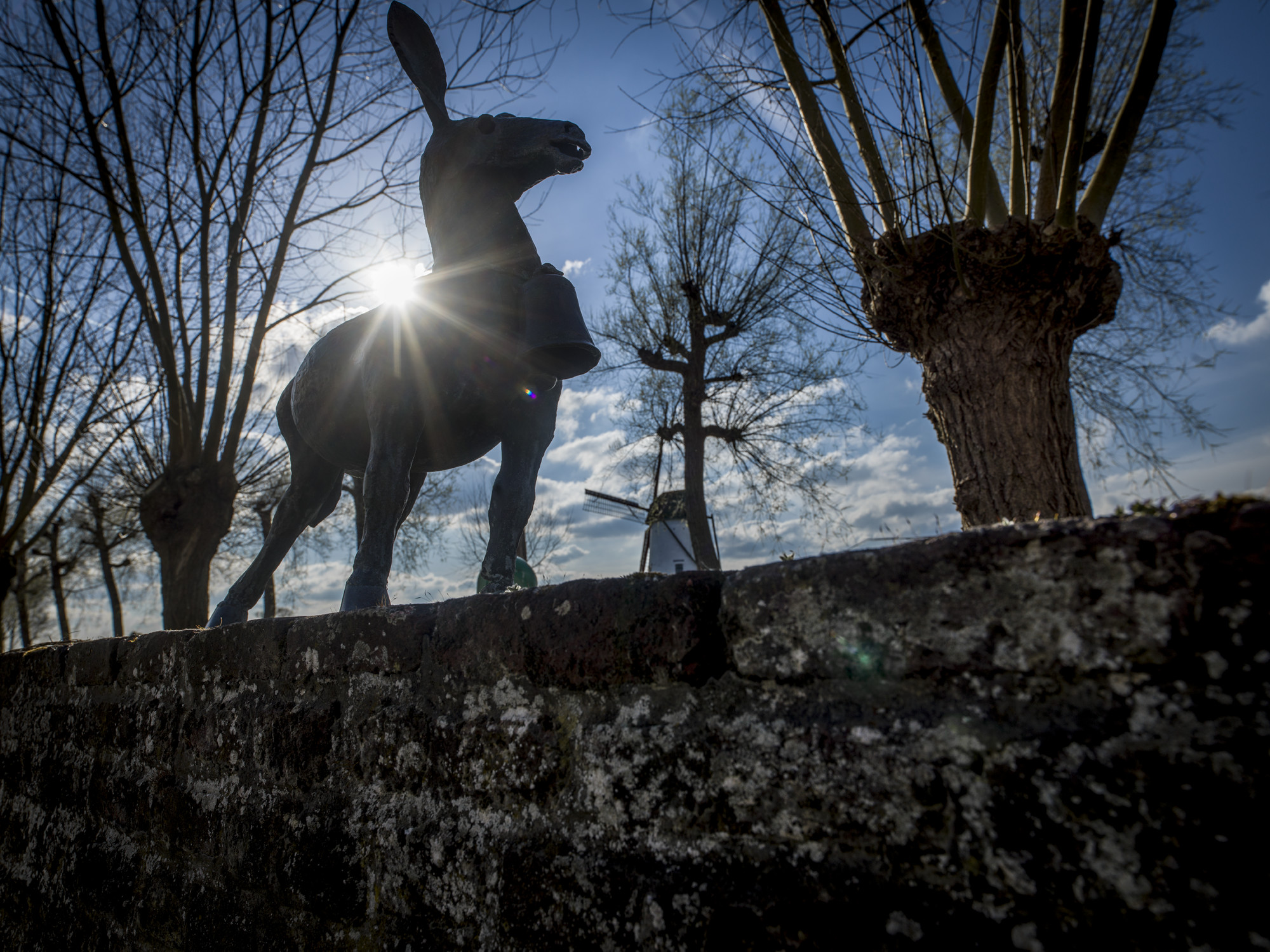 Jef Claerhout werd geboren in 1937 in Tielt, hij werkte lange tijd vanuit Damme en verhuisde uiteindelijk naar Oedelem. Een man van het Brugse Ommeland waar je dan ook op heel veel plekken een beeld van hem kan bewonderen. In Damme gaf hij vorm aan het populaire beeld van Uilenspiegel en het monument van de verbroedering met Damme in Duitsland op de Haringmarkt. In Sijsele vind je het monument ter ere van de verbroedering tussen Damme en Seyssel in Frankrijk. Ook in de turnzaal en in het gemeentehuis staan werken van Jef Claerhout. In Vivenkapelle, op het kruispunt van vele Damse wegen, staat het grote Paard van Vivenkapelle.