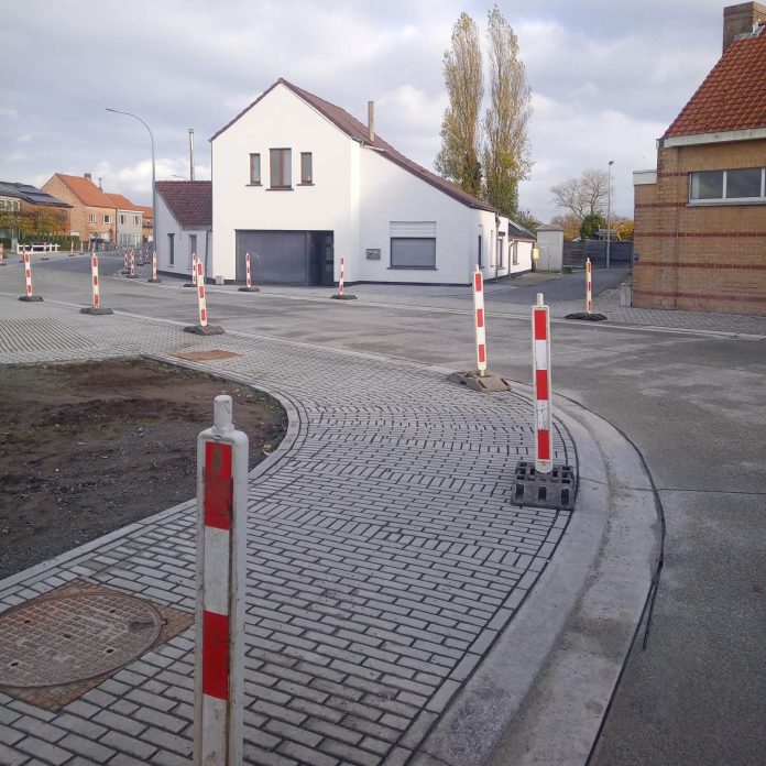 - Om te vermijden dat zwaar vervoer (+3,5 ton) schade zou veroorzaken aan de pas aangelegd voetpaden, worden deze afgezet met bakens.