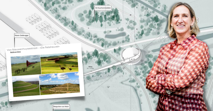 Het ontwerp van een ‘fietsheuvel’ in Knokke-Heist bestaat uit een veilige oversteek over de spoorweg in combinatie met een uitzichtpunt op de achterhaven van Zeebrugge, de polders en de natuurgebieden van Sashul en de Baai van Heist. Een eerste kostenraming voor de heuvel, brugconstructie en uitkijkplatform bedraagt €2.718.293 excl. BTW. Men hoopt op financiële ondersteuning van Toerisme Vlaanderen, Westtoer, de betrokken kustgemeenten en Europese subsidies. “Laten we deze plannen maar snel realiseren zodat inwoners en bezoekers de troeven van Knokke-Heist en de Oostkust met haar uniek landschap, erfgoed en natuur per fiets kunnen ontdekken. Van fietsen krijg je dorst en honger en ontdek je ook de typische streekproducten en biertjes.” geeft Cathy tot slot mee.