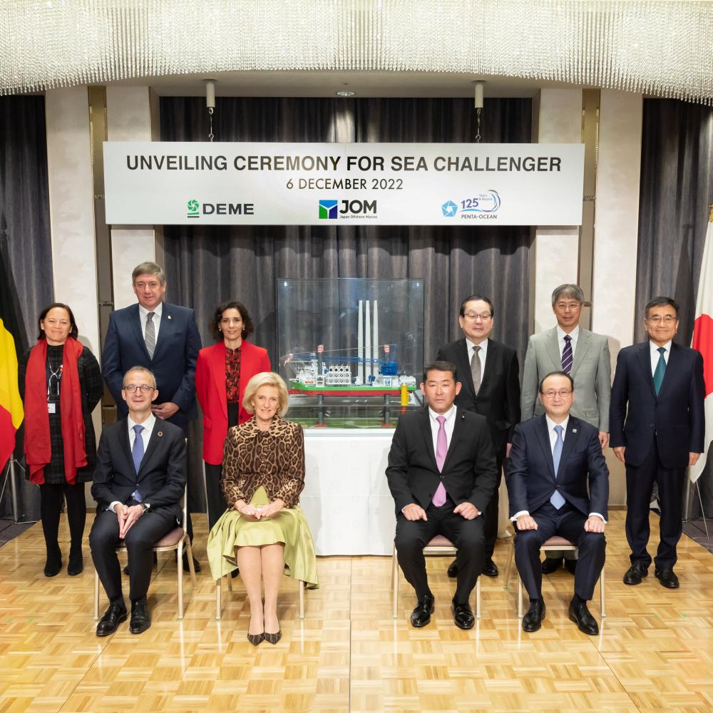 DEME met heel wat werknemers in de Zwinregio en Penta-Ocean Construction waren zeer vereerd toen Hare Koninklijke Hoogheid Prinses Astrid van België en de Japanse staatsminister van Land, Infrastructuur, Transport en Toerisme, Hiroo Ishii, samen het schaalmodel onthulden van het turbine-installatieschip ‘Sea Challenger’, voorzien van een verbeterde kraan van 1.600 ton, tijdens de ceremonie gehouden op 6 december 2022 in Tokio, Japan.