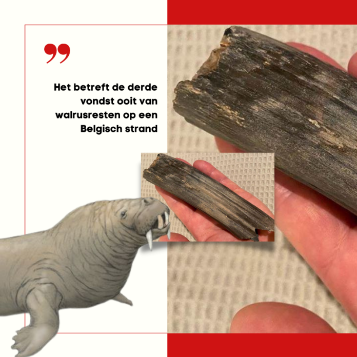 Fossielenzoeker Filip Vandenbruwane kende een mooie afsluiter van een regenachtige zoektocht toen hij op 1 december 2021 op het strand van Knokke-Heist een merkwaardige vondst deed. “Ter hoogte van een deels verdwenen zandkasteel merkte ik een benen voorwerp op. Ik zag onmiddellijk dat dit geen alledaagse vondst was, en dacht aanvankelijk aan de tand van een nijlpaard. Maar navraag bij het Vlaams Instituut voor de Zee en bij Nederlandse topexperten gaf al snel uitsluitsel. Ik was de gelukkige vinder van een tand van een lang geleden gestorven walrus”.