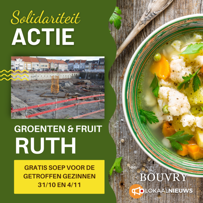 Aanstaande maandag 31 november en op vrijdag 4 november kunnen de getroffen gezinnen bij “Groenten en Fruit Ruth” de soep gaan ophalen. De winkel in de Kursaalstraat 66 is open vanaf 8 uur ’s morgens.