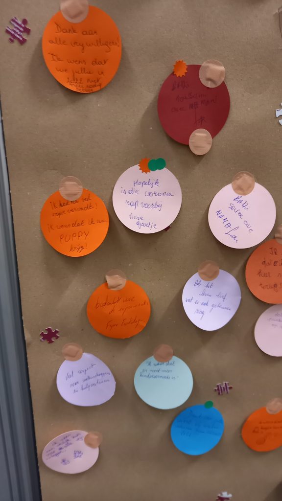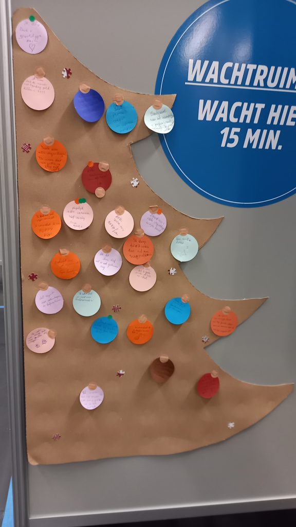 Nu de Sint terug naar Spanje is, verandert het vaccinatiecentrum langzaam in een echt kerstdorp. Een vrijwilligster heeft vorige week hard werk geleverd om wat kerstsfeer in het vaccinatiecentrum te brengen. Zij ging daarbij zeer creatief te werk met gebruikte maskers die eerst een grondige wasbeurt kregen. Ook de lege flacons waarin de vaccins geleverd worden en vervallen vaccinatiekaartjes van AstraZeneca, werden gerecupereerd als decoratiemateriaal. In elke wachtruimte hangt nu een kerstboom, uitgesneden uit karton. Hierop kunnen de passanten hun kerstwens op een papieren ‘kerstbal’ schrijven.