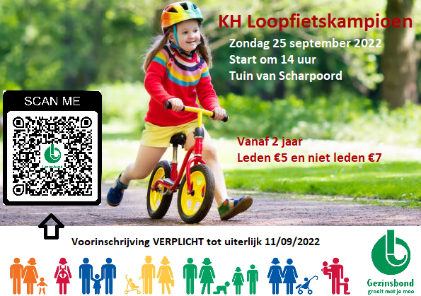 Op zondag 25 september 2022 om 14 uur organiseert de Gezinsbond Knokke het KH Loopfietskampioenschap voor kinderen vanaf 2 jaar. Dit ludieke evenement zorgt gegarandeerd voor plezier voor de allerkleinste fietsers. De rest van het gezin komt uiteraard supporteren voor hun echte wielerhelden.