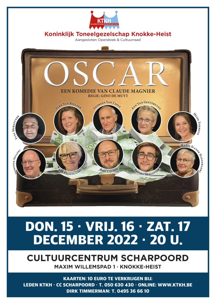 Op donderdag 15, vrijdag 16 en zaterdag 17 december 2022 telkens om 20 u. brengt het Koninklijk Toneelgezelschap Knokke-Heist in het Cultuurcentrum Scharpoord (Maxim Willemspad 1, Knokke-Heist) de komedie in ’t Knoks ‘Oscar’ van Claude Magnier in een regie van Gino De Muyt.