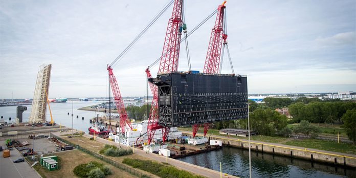 Met een gewicht van 2.500 ton, de oppervlakte van een kwart van een voetbalveld (66 m x 11 m) en een hoogte van 25 m, mag het terugplaatsen van de sluisdeur best een huzarenstuk genoemd worden.