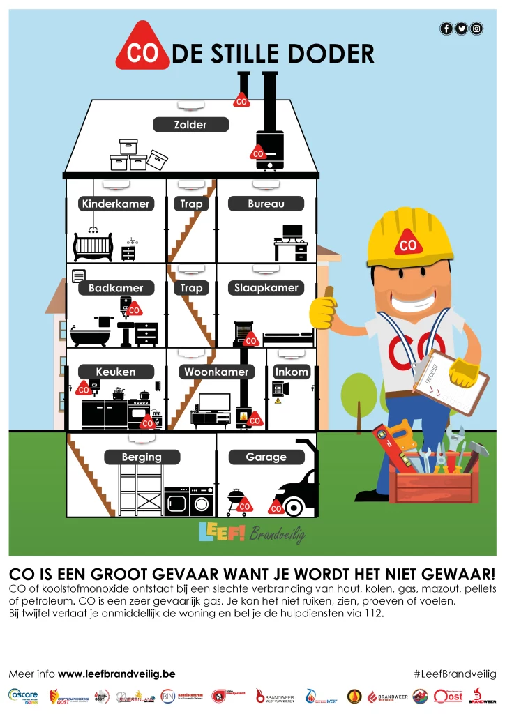 CO is een zeer gevaarlijk gas. Je kan het niet ruiken, zien, proeven of voelen. Het wordt via de longen opgenomen en verdringt de zuurstof in ons bloed.