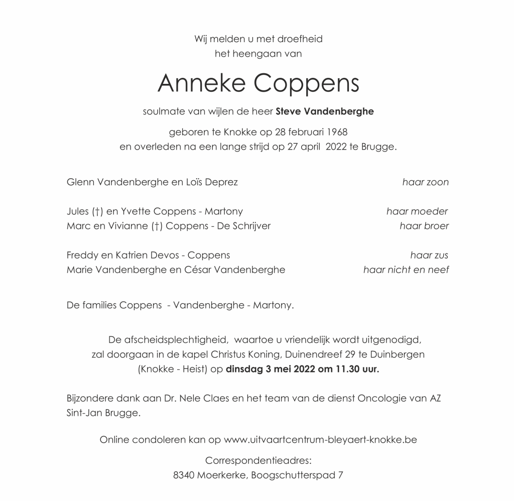 Aanmelden Welkom! Log in op je account jouw gebruikersnaam jouw wachtwoord Forgot your password? Get help Wachtwoord herstel Vind je wachtwoord terug jouw mailadres Er zal een wachtwoord naar je gemaild worden HomeKnokke-Heist Knokke-Heist Rouwbericht: Anneke Coppens By Redactie april 30, 2022 Hoeveel lezers deelden dit bericht via sociale media hier onder: 4366 Deel FacebookTwitterPinterestWhatsApp LAAT EEN REACTIE ACHTER Annuleer reactie Opmerking: Vul alstublieft uw commentaar in! Naam:* Vul hier uw naam in Email:* Je hebt een verkeerd e-mailadres ingevoerd! Vul hier uw e-mailadres in Website: Bewaar mijn naam, e-mailadres en website in deze browser voor de volgende keer dat ik een opmerking maak. Vorig artikelHet Weer vandaag in Knokke-Heist en de ZwinregioVolgend artikel“Vrij” van balletgroep Le Cygne Ook dit moet je even lezen 00:07:15 Cultuur De Tentuinstelling 2022, waar gaat het over? 00:03:24 Sport Voorzitter R Knokke FC over het afgelopen voetbal seizoen Knokke-Heist Jan Colpaert en Christiane Verelst zijn 50 jaar getrouwd