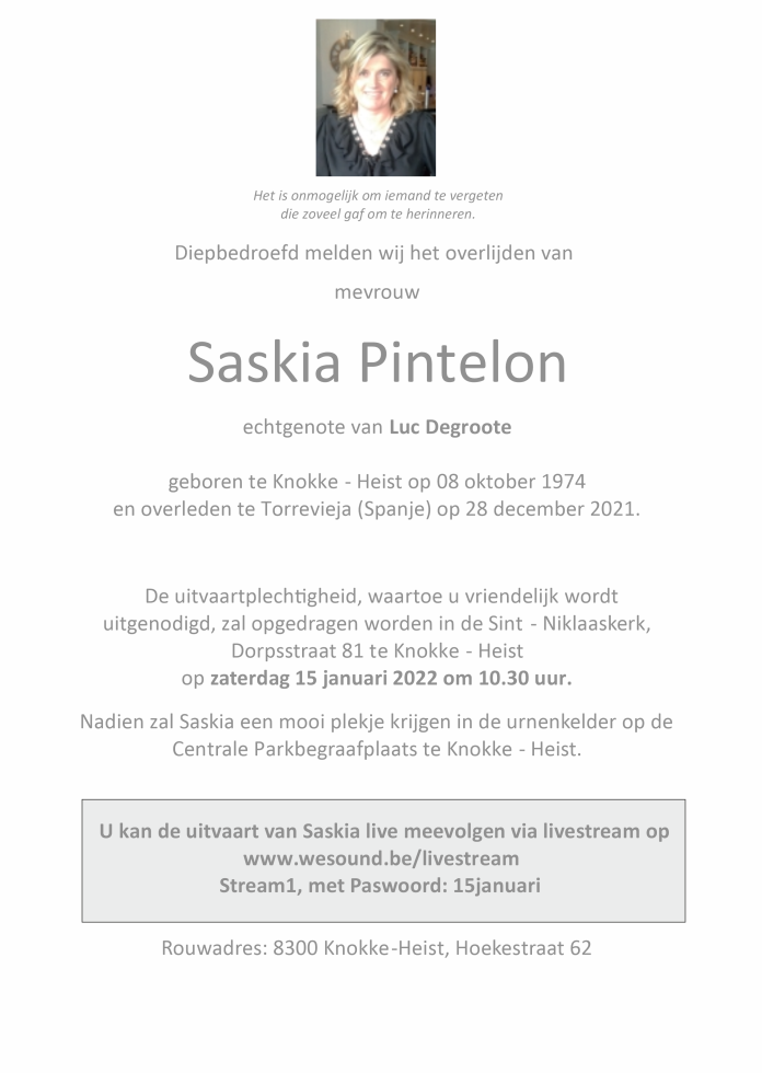 ' HomeKnokke-Heist Knokke-Heist Rouwbericht: Saskia Pintelon By Redactie januari 10, 2022 Facebook Twitter Pinterest WhatsApp Hoeveel lezers deelden dit bericht via sociale media hier onder: 14168 Share Facebook Twitter Pinterest WhatsApp Vorig artikelHet project OP-PEIL zoekt landbouwers uit de ZwinregioVolgend artikelMister Barish een idee ontstaan op het strand van Knokke-Heist Redactiehttps://www.kneistikrant.be Ook dit moet je even lezen Het Weer Het Weer in Knokke-Heist en de Zwinregio Knokke-Heist Ryan Lodens over Schoolgrappling Justitie Koppel uit Knokke-Heist krijgt celstraf na sociale fraude LAAT EEN REACTIE ACHTER Annuleer reactie Opmerking: Vul alstublieft uw commentaar in! Naam:* Vul hier uw naam in Email:* Je hebt een verkeerd e-mailadres ingevoerd! Vul hier uw e-mailadres in Website: Bewaar mijn naam, e-mailadres en website in deze browser voor de volgende keer dat ik een opmerking maak. Hier praat men over Knokke-Heist Ryan Lodens over Schoolgrappling Knokke-Heist Update Covid besmettingen in de Zwinregio Knokke-Heist Geef bloed en maak het verschil in 2022 Knokke-Heist Een spuit voor iedere Knokke-Heistse spruit Knokke-Heist Heb je recht op verhoogde tegemoetkoming bij een zelftest Laad meer