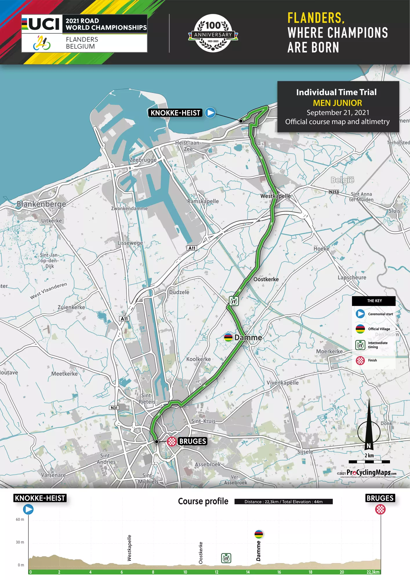 Starten doen de rensters op de startramp op het Noordzeestrand, ter hoogte van het casino. De Junioren Vrouwen trekken snel landinwaarts om in een quasi rechte lijn richting Brugge en de finish op ’t Zand te fietsen.