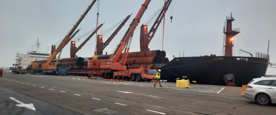 Onlangs liep de Liberiaanse bulkcarrier ‘Tanzanite’ de haven van Zeebrugge binnen om af te meren aan de Zweedse Kaai. Onmiddellijk na het afmeren startte de lossing van dertien grote buispalen. Elke paal weegt 70 ton, is 40 meter land en heeft een diameter van 2,5 meter.